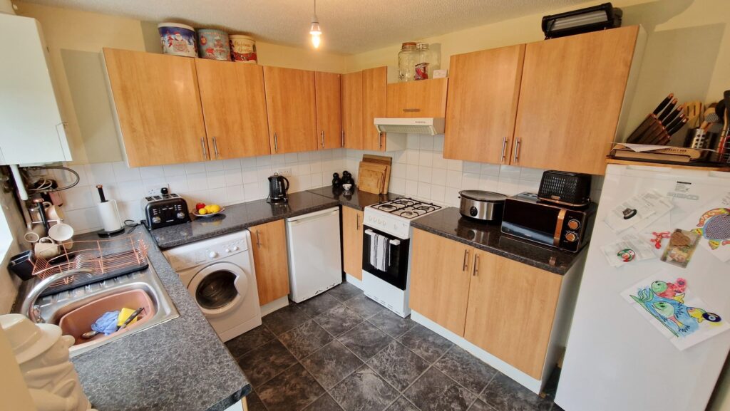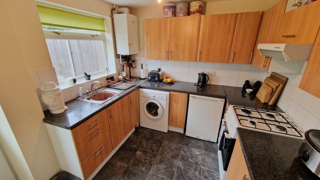 Kitchen: 3.10m x 2.70m (10'2" x 8'10"), The lounge / diner benefits from dual aspect views with windows overlooking both the front and rear gardens. There is an electric wall mounted fire and 3 gas central heating radiators. There are wooden doors that lead to the porch and kitchen and an open staircase that provides access to the first floor.
