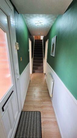 Downstairs WC: 1.30m x 1.85m (4'3" x 6'1"), The downstairs WC is located to the front of the property and features a push button toilet and a wall mounted wash hand basin. There is also a UPVC double glazed window with privacy glass and a gas central heating radiator.