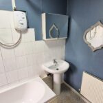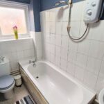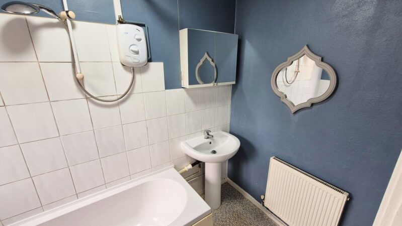 Bathroom: 1.45m x 2.60m (4'9" x 8'6"), The bathroom is located to the rear of the property over the kitchen / diner. It features a white suite including a bath with a mixer tap and an electric shower, a push button toilet and a wash hand basin with matching pedestal and mixer tap. The room also benefits from a gas central heating radiator and a UPVC double glazed window with privacy glass.
