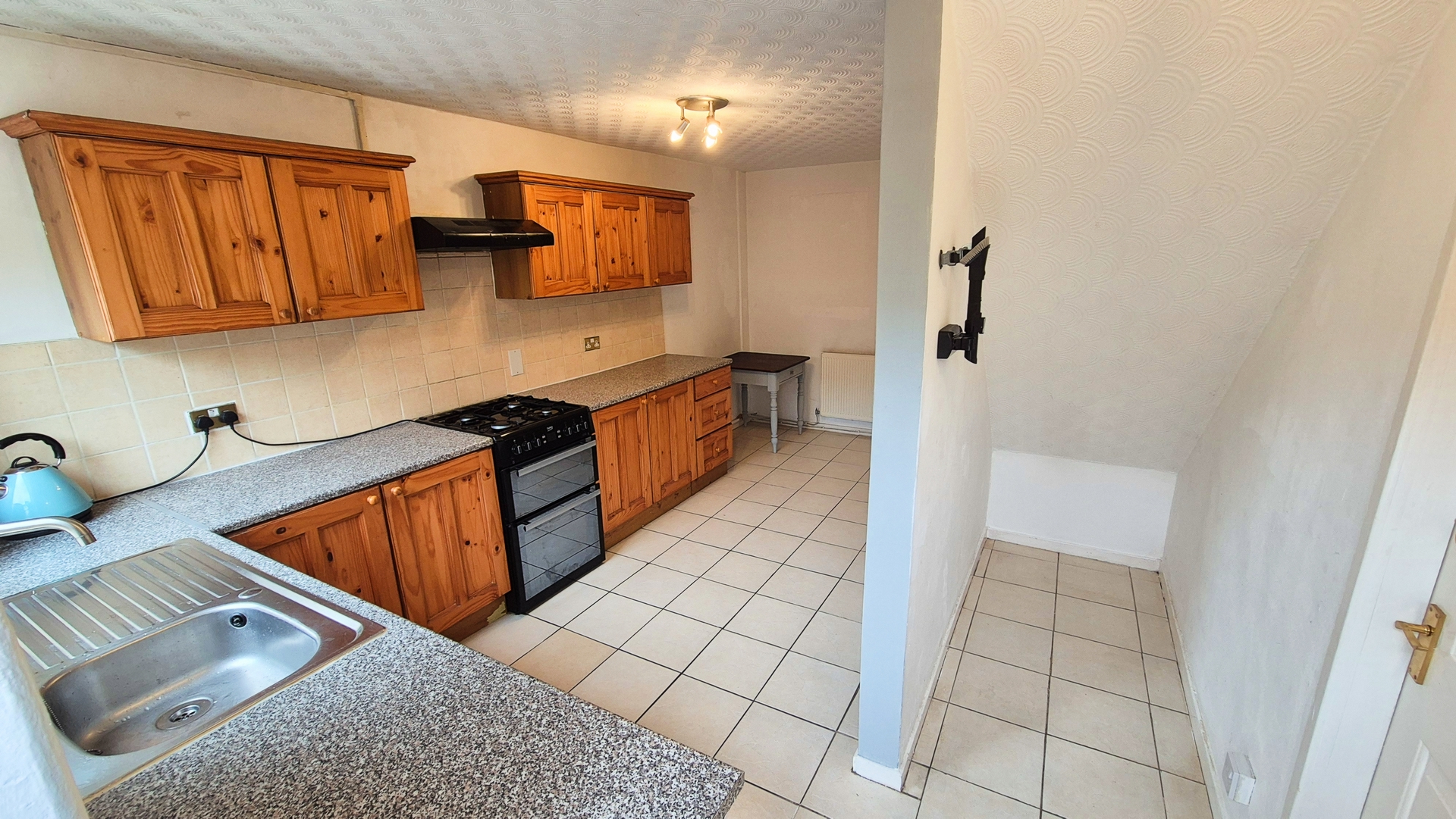 Kitchen / Diner: 2.30m x 5.00m (7'7" x 16'5"), The kitchen / diner is located to the rear of the property and can be accessed from either the living room or the hallway. There are a range of matching wall and base units with a granite effect worktop including a freestanding gas cooker with a cooker hood above and spaces for a freestanding washing machine and tumble dryer. The room also benefits from a gas central heating radiator, a UPVC double glazed window and a UPVC double glazed door that leads to the garden.