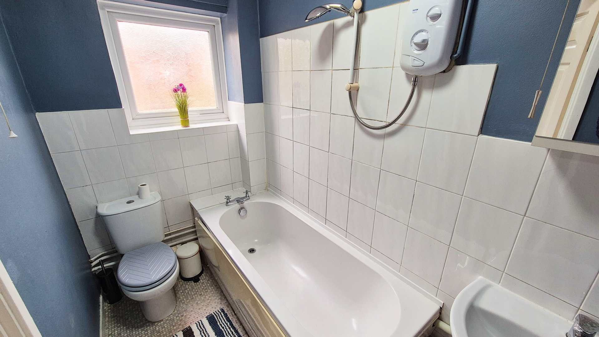 Bathroom: 1.45m x 2.60m (4'9" x 8'6"), The bathroom is located to the rear of the property over the kitchen / diner. It features a white suite including a bath with a mixer tap and an electric shower, a push button toilet and a wash hand basin with matching pedestal and mixer tap. The room also benefits from a gas central heating radiator and a UPVC double glazed window with privacy glass.