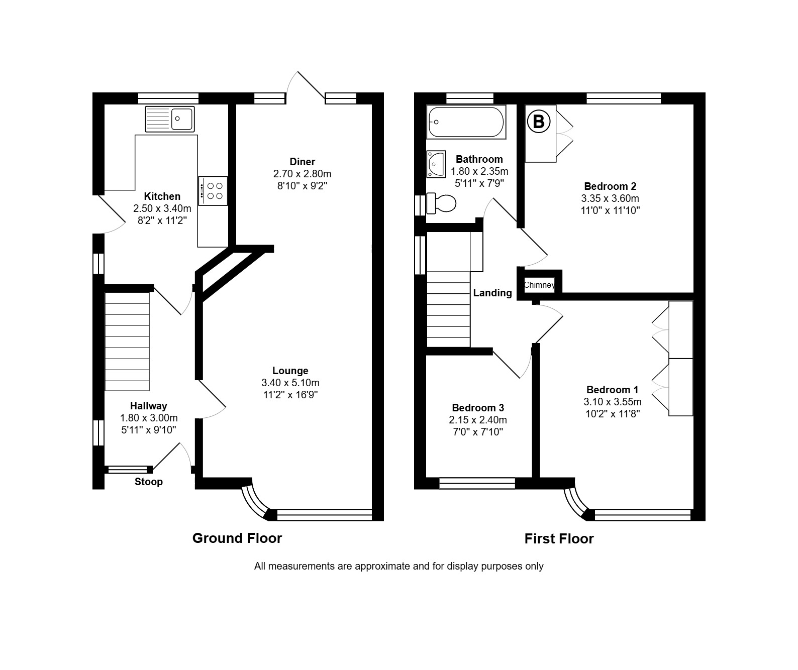 Bedroom 1: 3.10m x 3.55m (10'2" x 11'8"), Bedroom 1 is located to the front of the property over the lounge. It benefits from a large UPVC half bay window, a gas central heating radiator and built-in wardrobes.