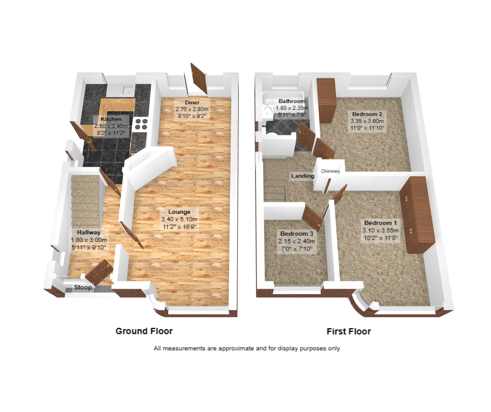Diner: 2.70m x 2.80m (8'10" x 9'2"), The diner is located to the rear of the property and can be accessed from the lounge or via a UPVC double glazed door from the patio. There are matching UPVC windows above and either side of the door and also a large gas central heating radiator.