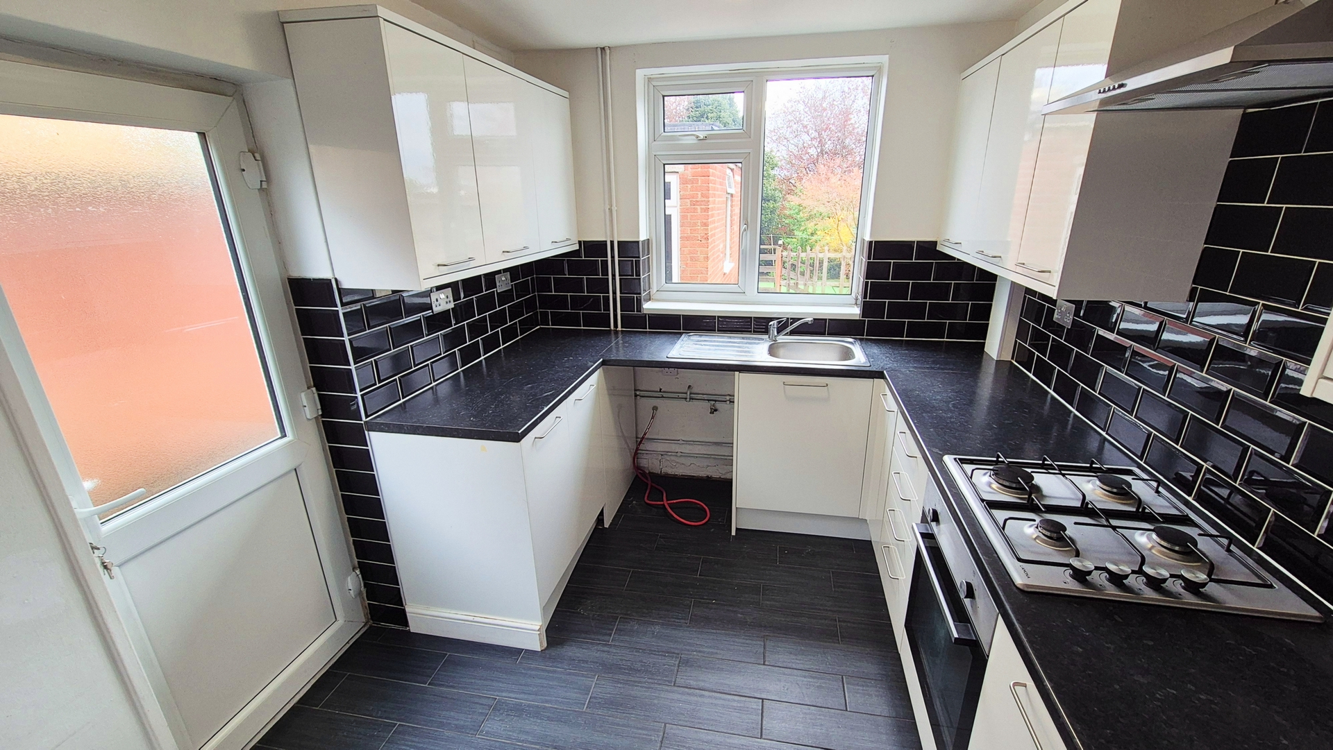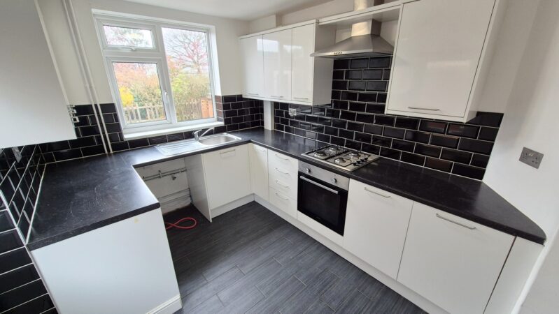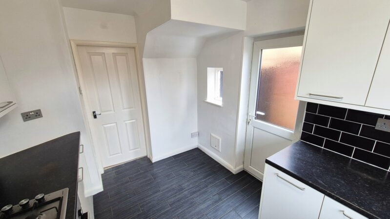 Kitchen: 2.50m x 3.40m (8'2" x 11'2"), The kitchen is located to the rear of the property and features a range of modern wall and base units with a granite effect worktop. There is a built-in single electric oven, a gas hob with a cooker hood above and space for a freestanding washing machine. The room has a tiled floor, a UPVC double glazed window that over looks the patio, a UPVC double glazed door that leads to the side and a small single glazed window to the side.