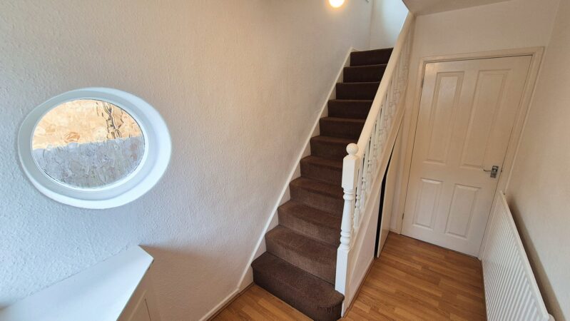 Hallway: 1.80m x 3.00m (5'11" x 9'10"), The hallway is accessed from the driveway via a wooden front door with matching windows above and to the side. The hall provides access to the lounge / diner, the kitchen and a staircase that leads to the first floor. It benefits from laminate flooring, a gas central heating radiator and a small round single glazed window.