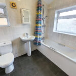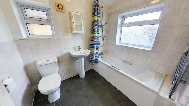 Bathroom: 1.80m x 2.35m (5'11" x 7'9"), The bathroom is located to the rear of the property over the kitchen. It features a modern white suite including a push button toilet, a wash hand basin with mixer tap and pedestal and a bath with a mixer tap and a shower above. The room also benefits from 2 UPVC double glazed windows with privacy glass, and a chrome towel radiator.