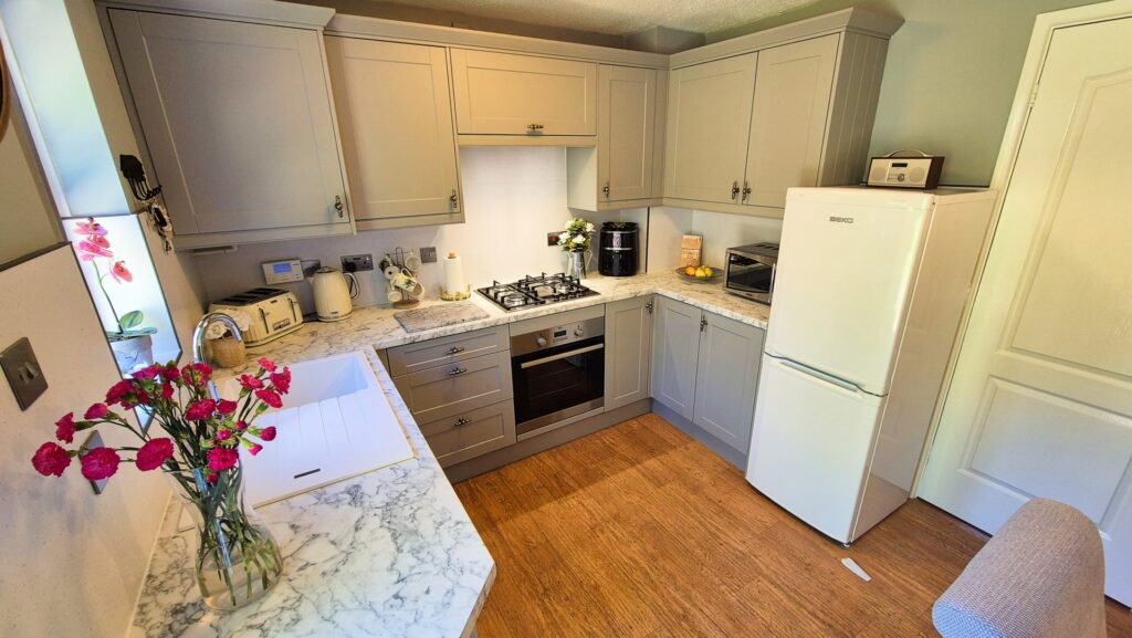 Kitchen / Diner: 3.80m x 2.80m (12'6" x 9'2"), The kitchen / diner features a modern grey shaker style kitchen with a marble effect worktop and a white sink. There is a built-in electric oven, a gas hob with a cooker hood above and spaces for a freestanding washing machine and fridge freezer. The room also benefits from a gas central heating radiator, a UPVC double glazed window and a large sliding patio door that leads to the garden.