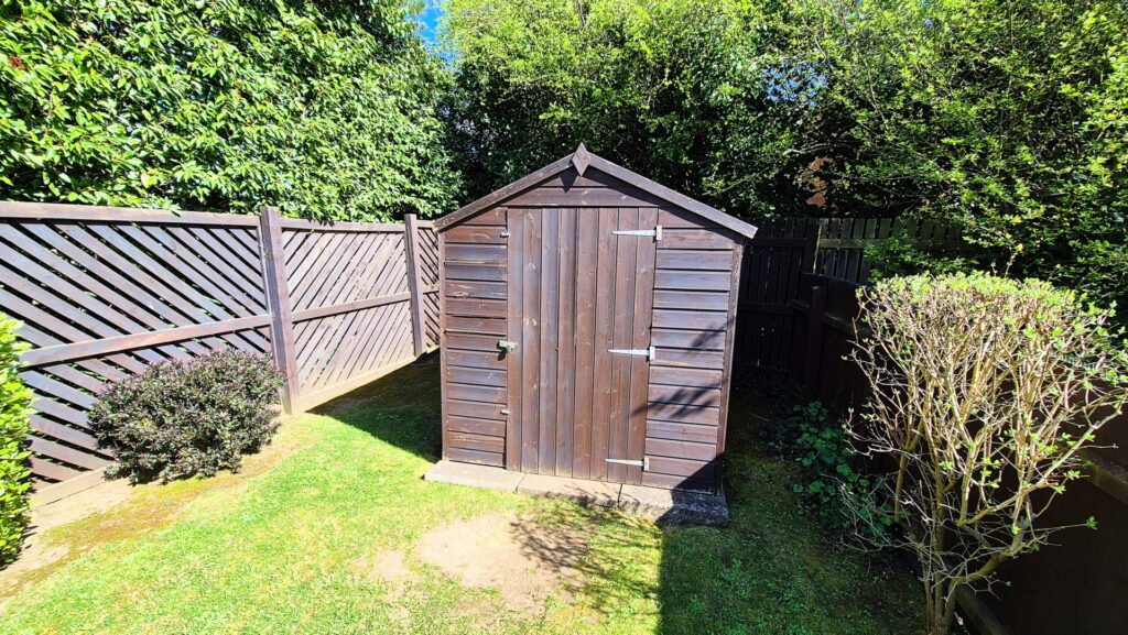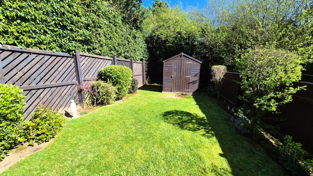 Outside: To the front and side of the property there is a large lawn, several mature plants and two parking bays directly in front. To the rear of the property there is a well landscaped garden made up of a small patio and a large lawn area which is surrounded by mature plants, bushes, and trees. There is a wooden shed at the end of the garden and a wooden gate that provides side access to the property.