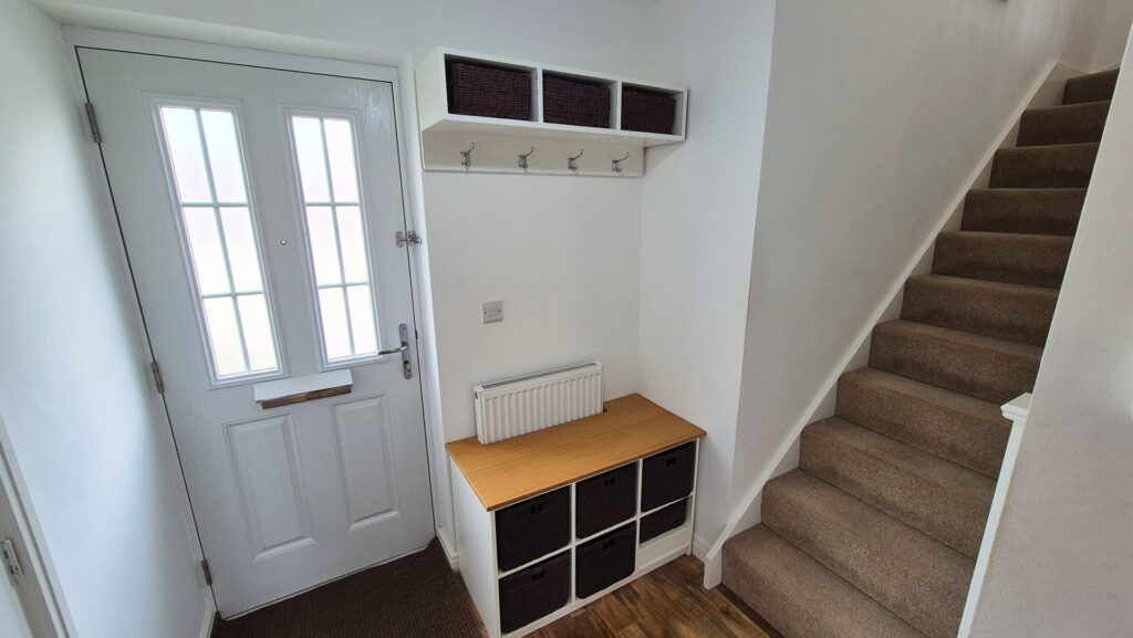 Hallway: 1.80m x 1.90m (5'11" x 6'3"), The hallway is accessed from the front of the property via a composite front door. There are wooden doors that lead to the downstairs WC and the living room, vinyl flooring, and a gas central heating radiator.