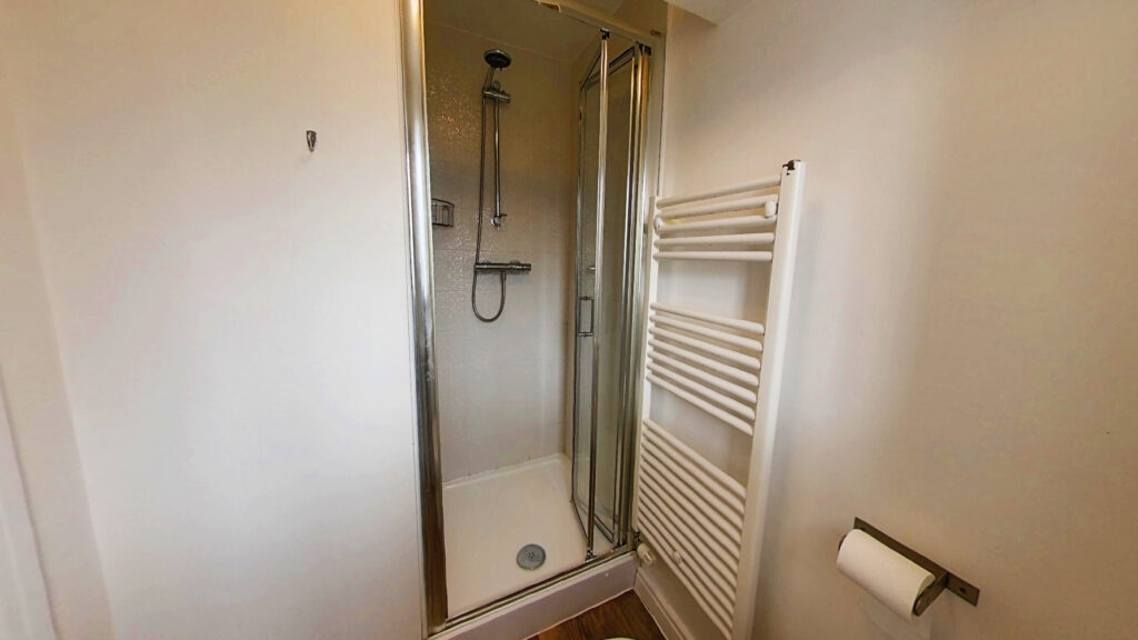 Ensuite Shower Room: 1.35m x 2.00m (4'5" x 6'7"), The ensuite is located off bedroom 1. It features a white suite including a push button toilet, a wash hand basin with pedestal and a mixer tap, and a built-in shower enclosure with a mixer shower. The room also benefits from vinyl flooring, a small UPVC double glazed window with privacy glass and a gas central heating towel radiator.
