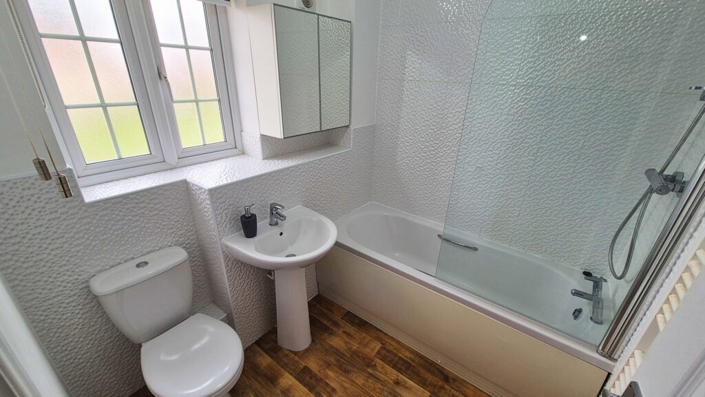 Bathroom: 2.00m x 2.00m (6'7" x 6'7"), The family bathroom is located to the front of the property over the kitchen. It features a white suite including a push button toilet, a wash hand basin with pedestal and a mixer tap, and a bath with a glass shower screen and a mixer shower. The room benefits from vinyl flooring, a white towel radiator and a UPVC double glazed window with privacy glass.